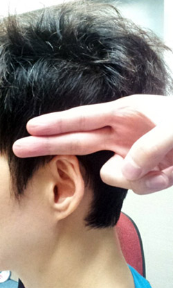 率谷穴位置: 1) 耳尖上隔兩隻手指位。